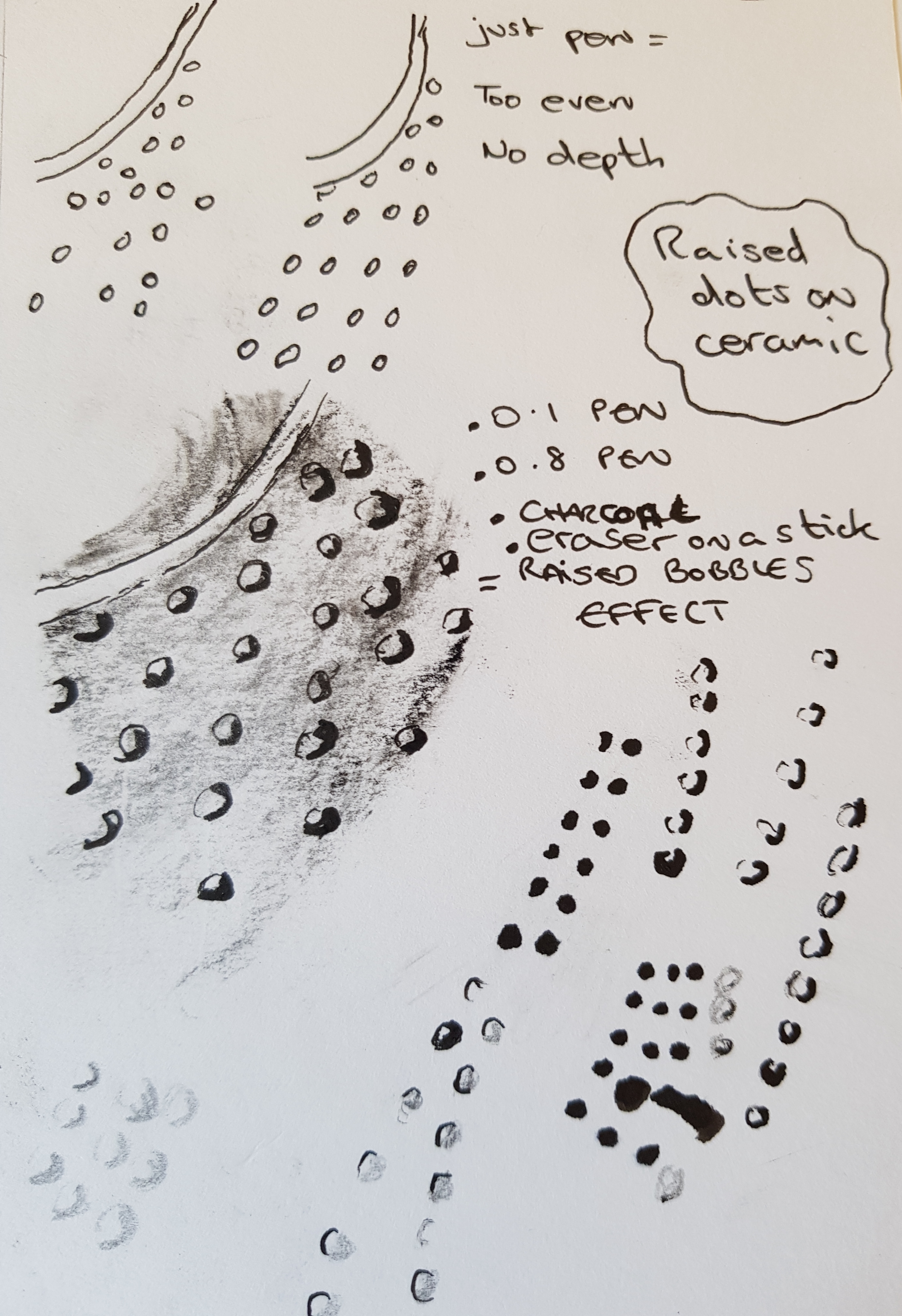 The raised pimples were hard to re-create. Just drawing round circles did not work – too flat. I then tried to draw 3D circles. Thick pen one side of the circle, thin pen the other side. This seemed to work better. I then swept and smudged charcoal over the pimples to give an impression of a surface. I then dragged an eraser thought parts of the charcoal to show shine of the ceramic surface. This was a better effect. To improve the image I would need to be more mathematical with drawing the circles, i.e. size and positioning.