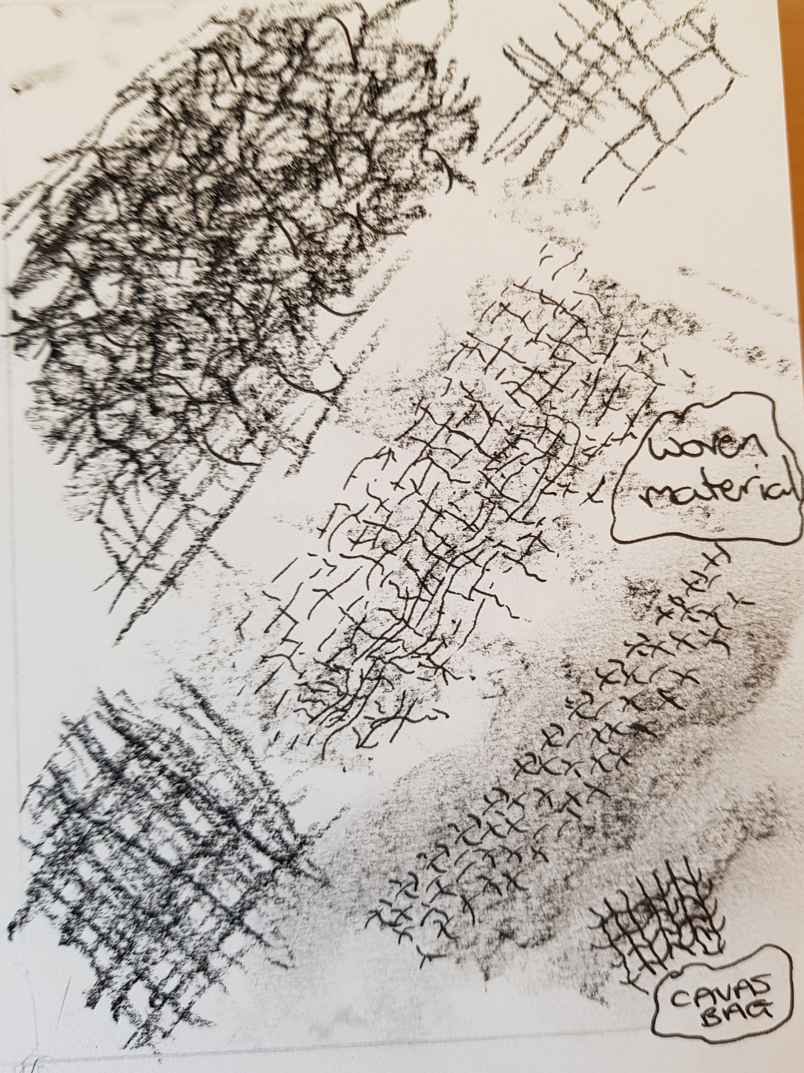The most effective method I tried was using drawing pens to create fine lines and show actual weaving of these lines (in the middle of the images below). I then smudged charcoal over the top of the lines to create a feeling of less-defined cloth.