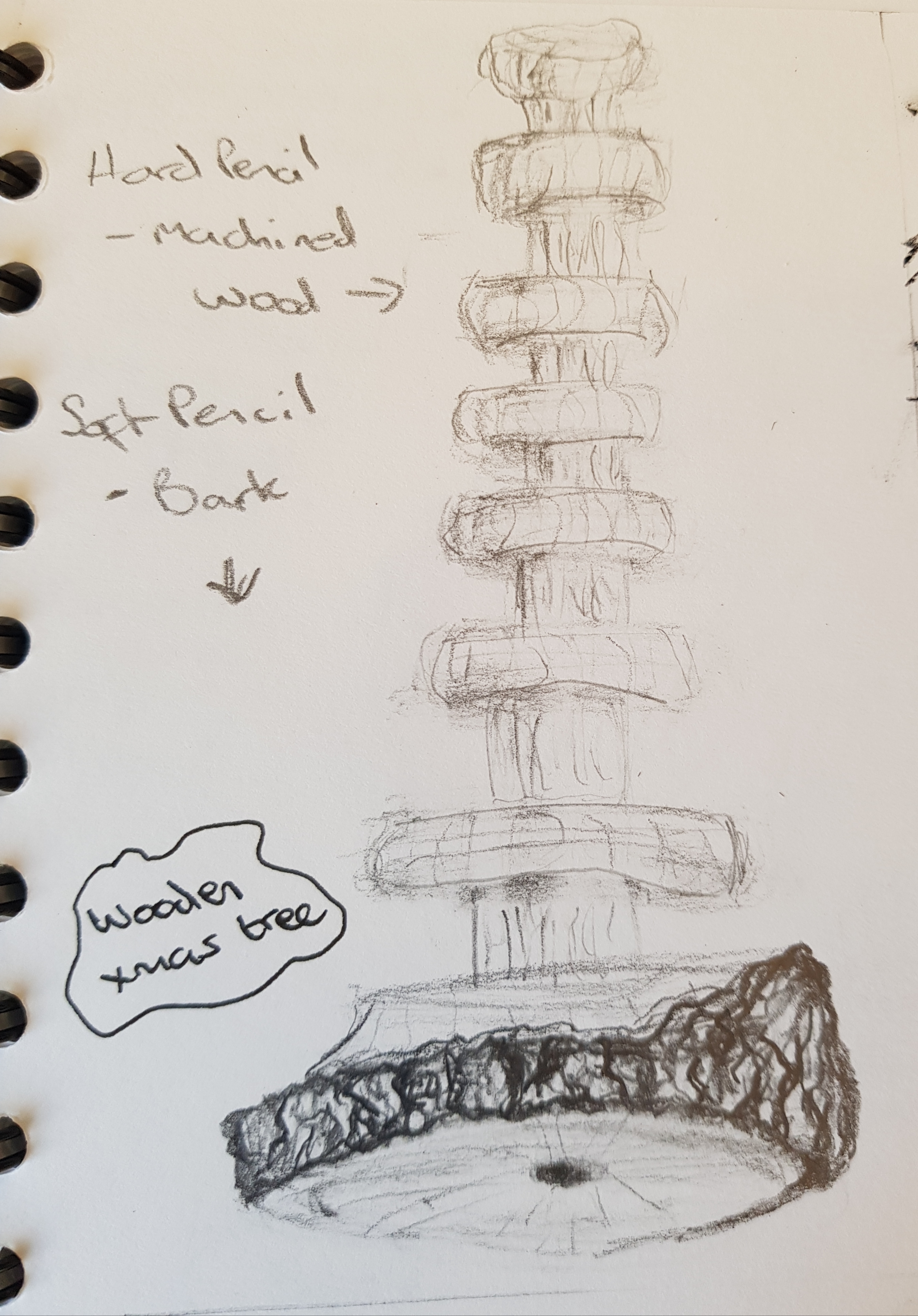 Pencil seemed the best medium for this. I used a hard pencil – making sparse, refined lines for the machined areas. I used soft, dark pencil for the bark – to created ragged lines and show rugged contrast.