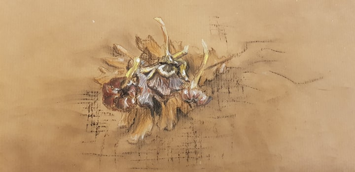 There probably is not enough contrast between the mushrooms and the leaf in the drawing – maybe the leaf should be paler to push the mushrooms further forward?