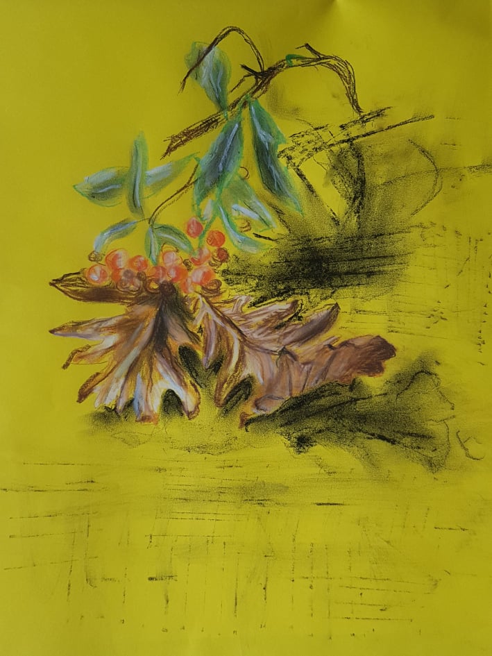 I took a bag and some children’s scissors and went out into the autumn day to collect a variety of leaves berries, twigs and seeds. I used yellow paper for the image below and was quite pleased with the result – though the drawing is a little clumsy.