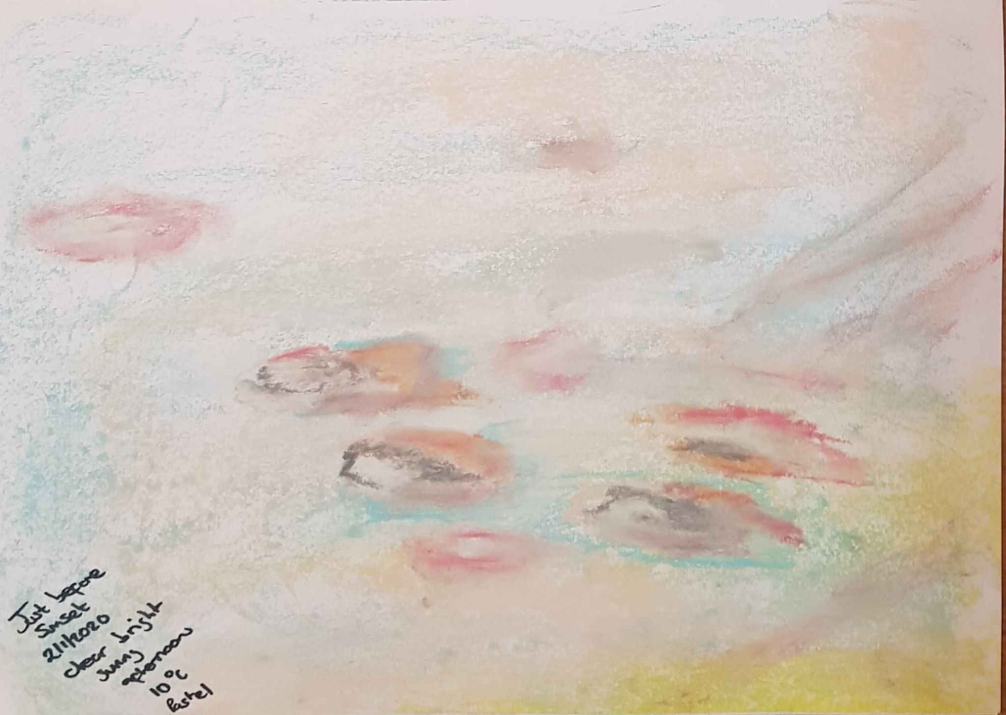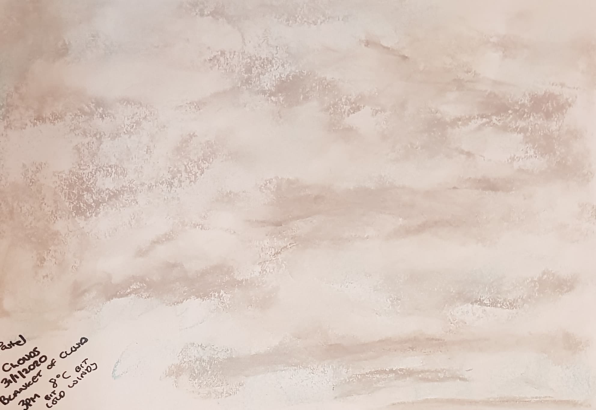 I drew clouds and sky on a few different days at different times of day. I love looking at the sky, so I wanted to put energy and excitement into my sky drawings. I used sweeps of pastel and put different colours into the mix trying to reproduce what I saw and felt. This method suited the grey sky best – it was a blanket of light grey with shots of dark running though it that hinted at the direction of the wind.