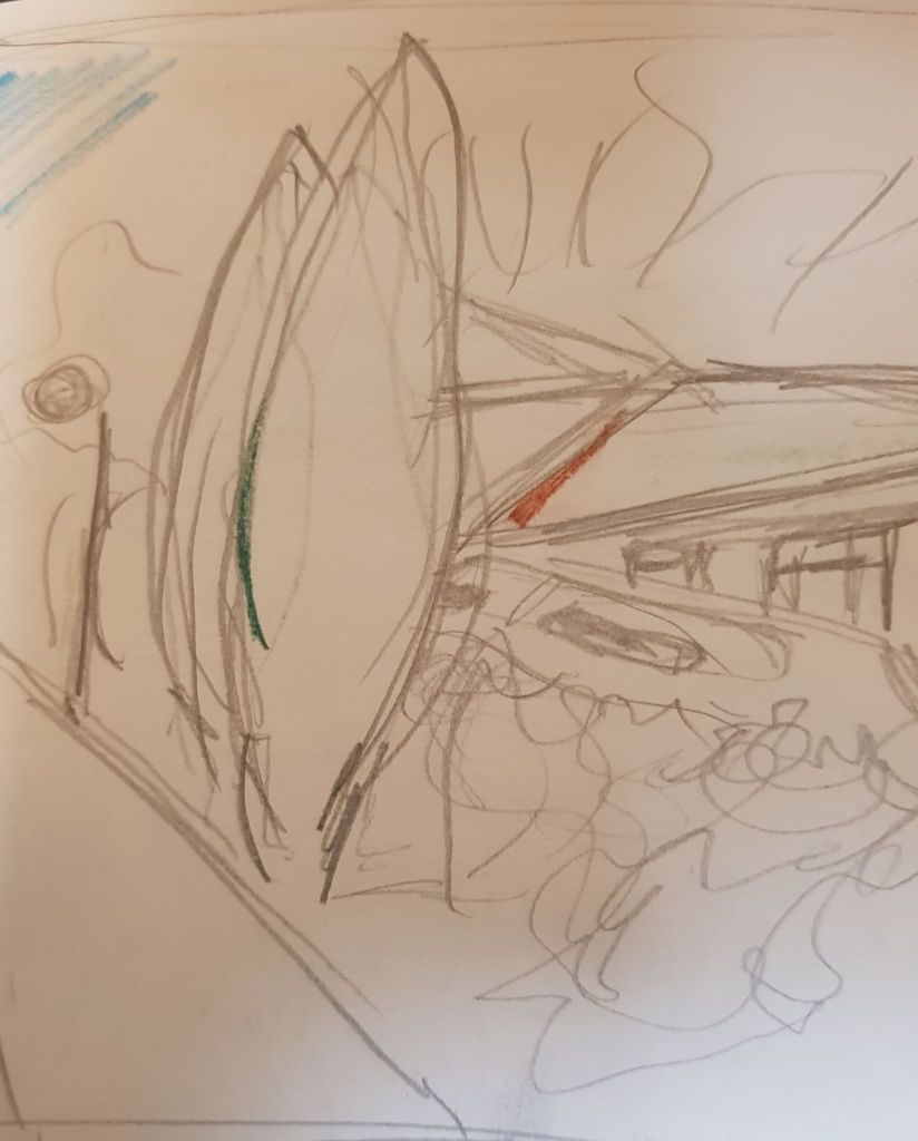 I decided to work on the original sketch as a limited palette piece as the subject naturally seemed to have three colour types: blue for the sky, green for the trees and grass, brown for the man-made structures. I liked the intersections and angles of the objects and the slant of the ground. The tone of the piece doesn’t work as well as it should – I needed to have worked on subtle gradients of tone more – especially on the roofs of the houses. The angles (perspective) of the roofs aren’t quite right. I quite like the pencil marks that suggest the slope in the foreground and the scribbles to create the bushes. The use of just three colours does make the composition more striking.
