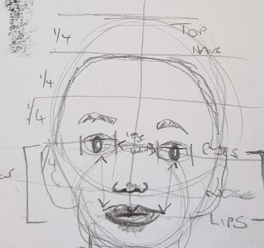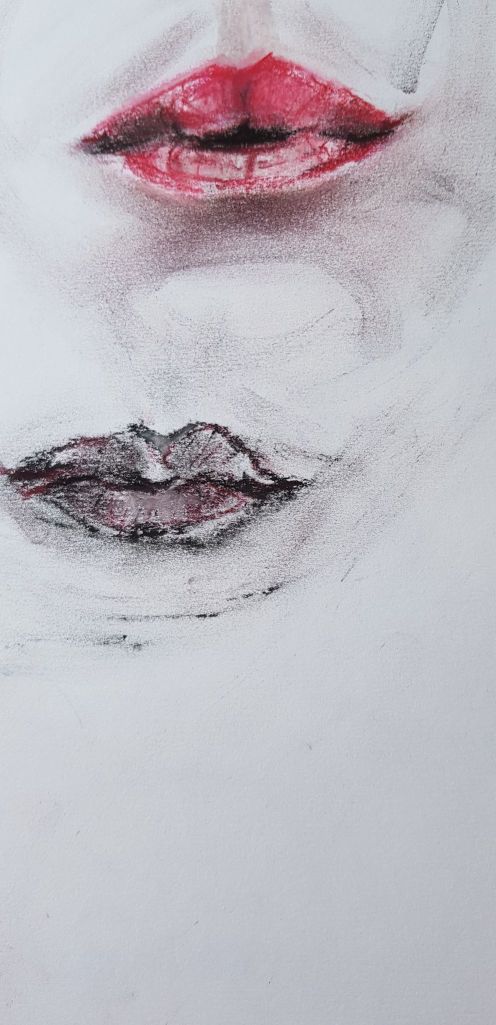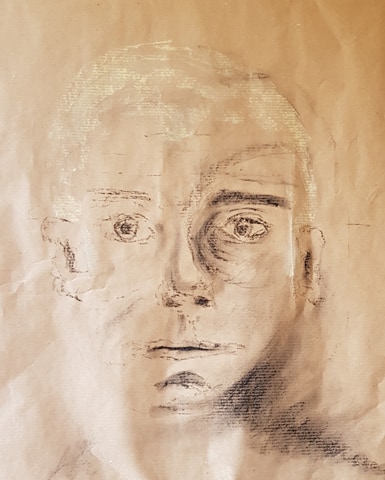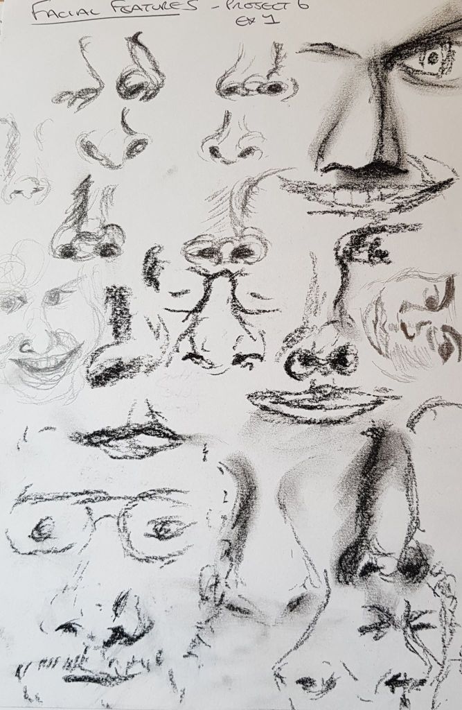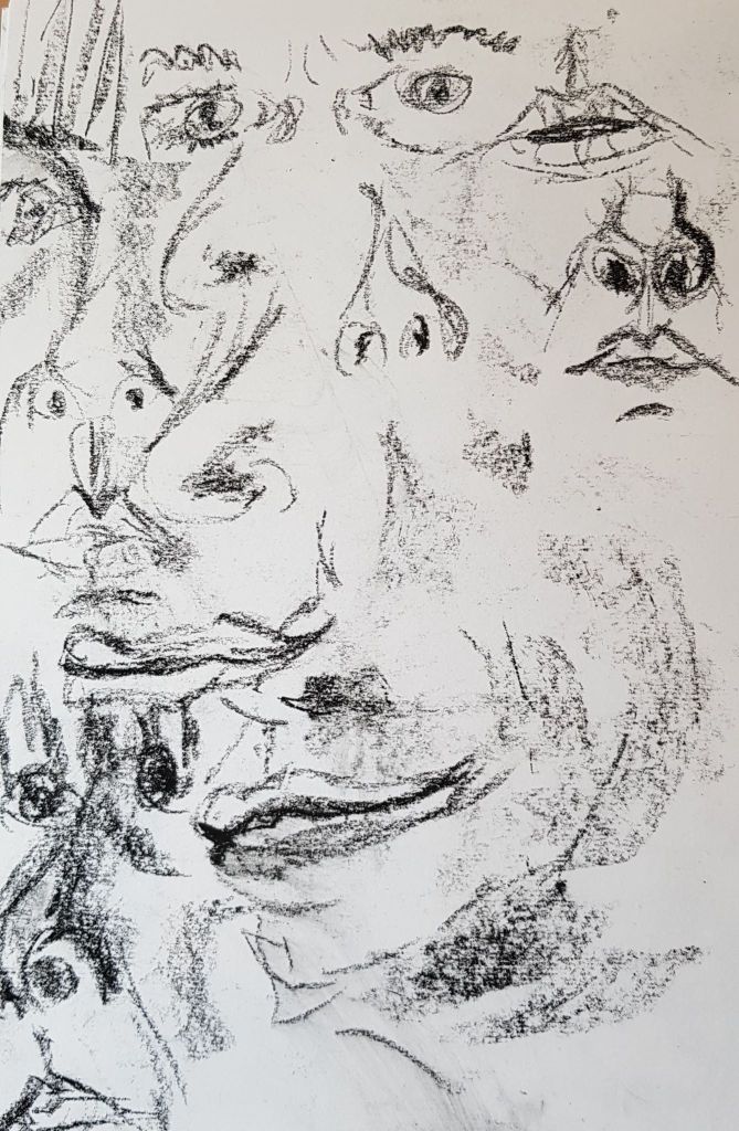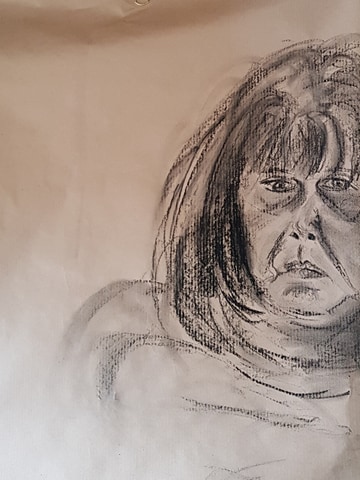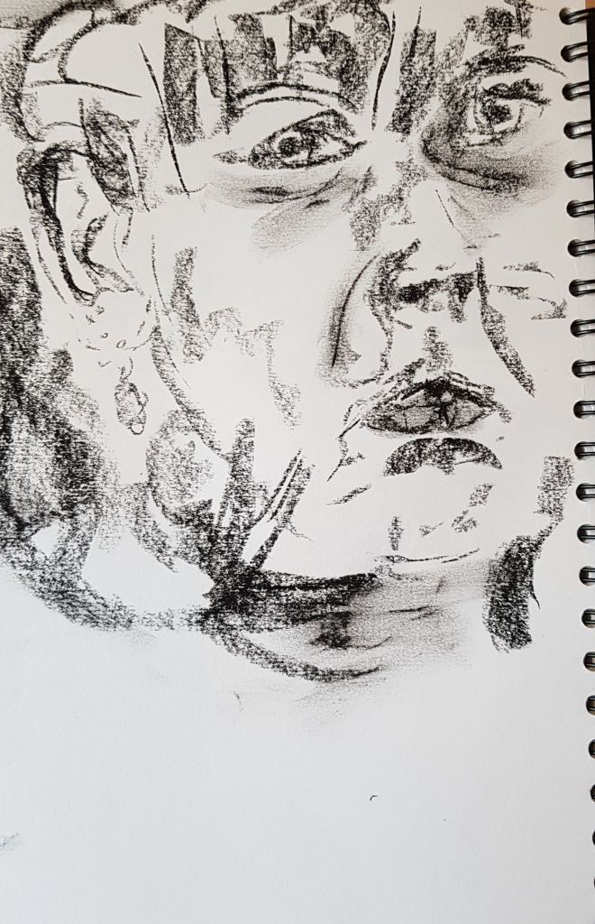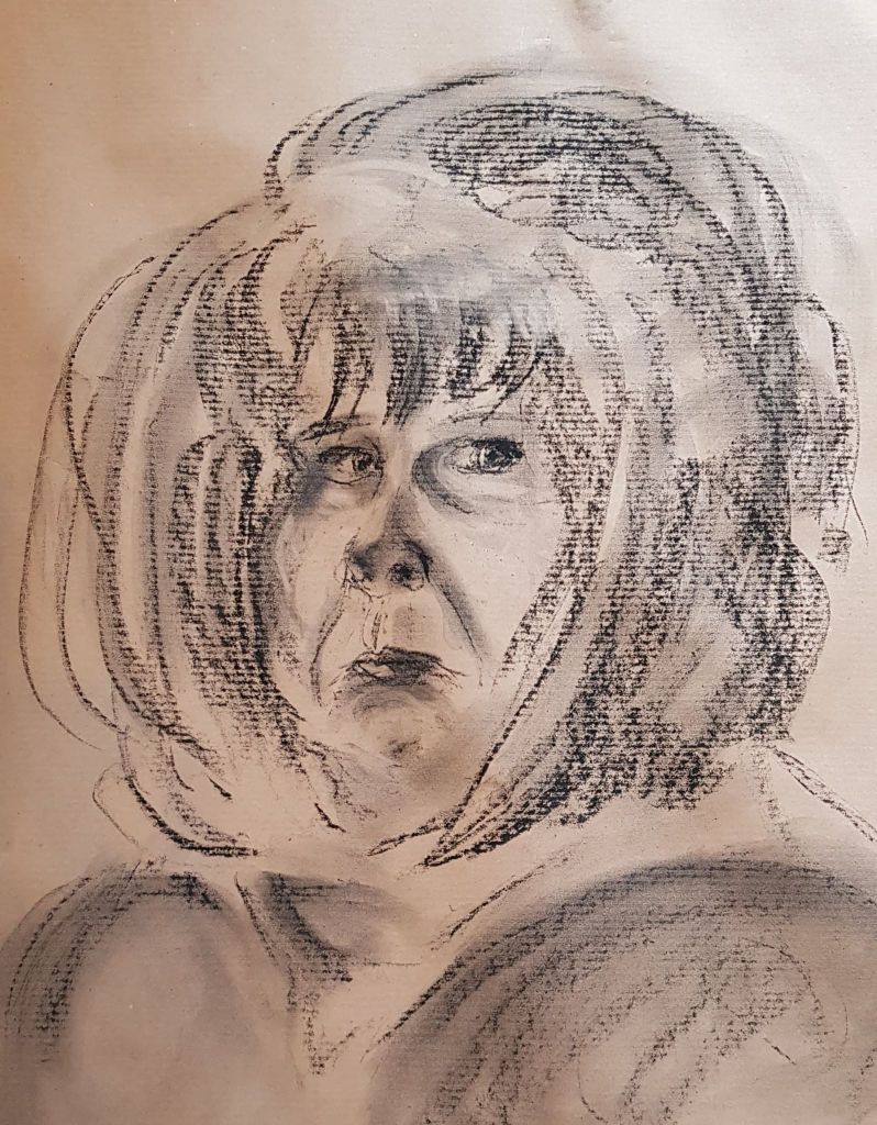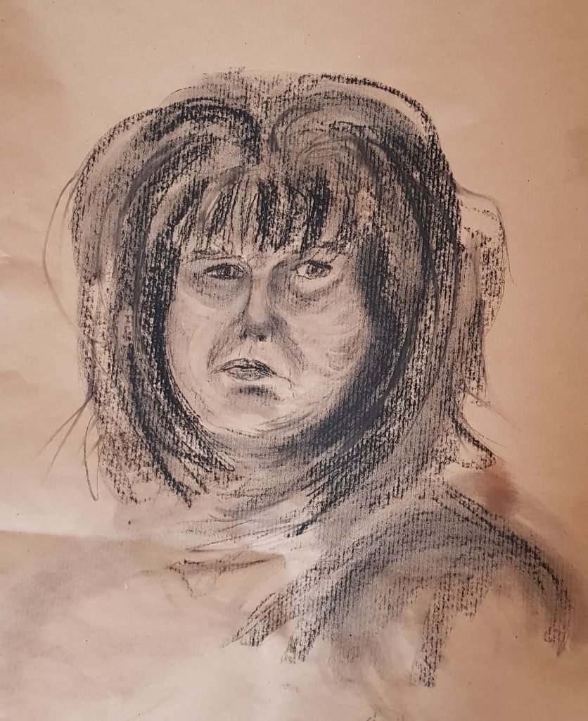 I cut into the charcoal with an eraser on the image above and liked the effect. It gives a greater range of tone and gave the image some life. The image was fairly like me, but the mouth is at a strange angle. I look fairly miserable – but I was concentrating!