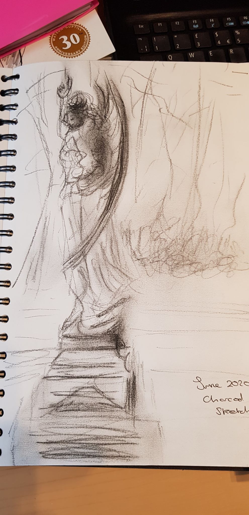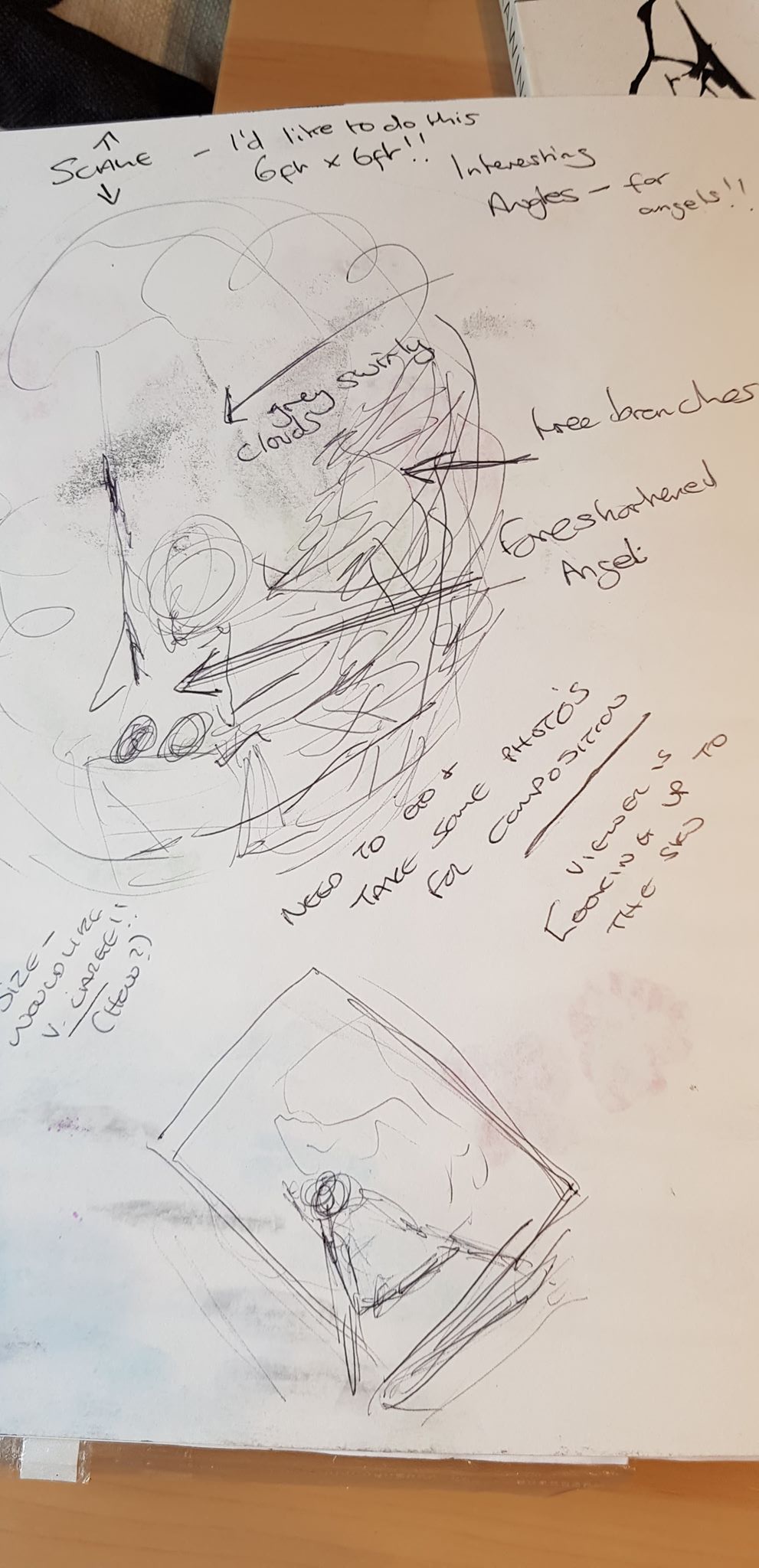 I then worked on the shape and perspective of the angel. I wanted imagined lines to converge onto her hand and index finger pointing sky-ward – to again add drama to the story and give focus to the direction of the piece.