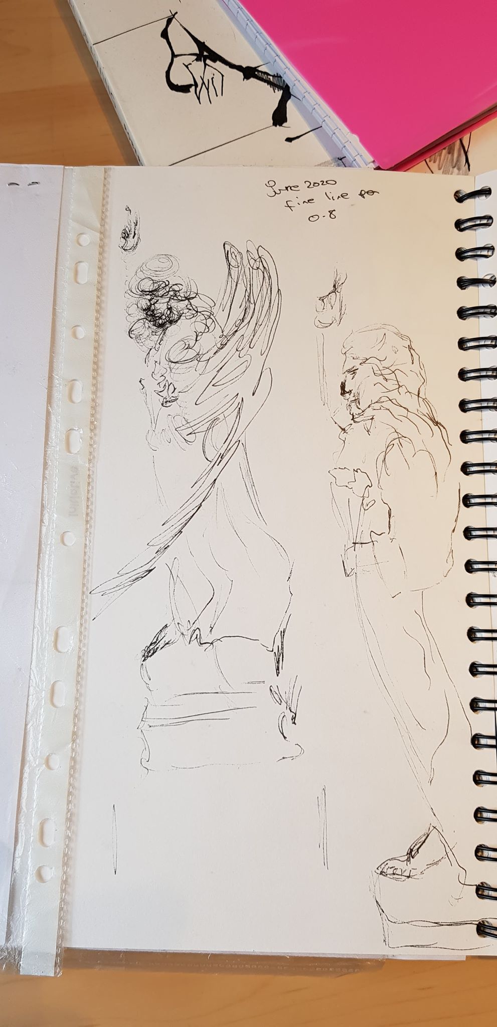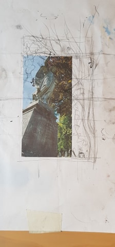 I considered the composition I wanted for my drawing and took elements from a couple of the photos I had taken, moving them around in my imagination and testing on printouts and in my sketchbook to create the picture I wanted.