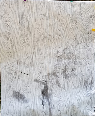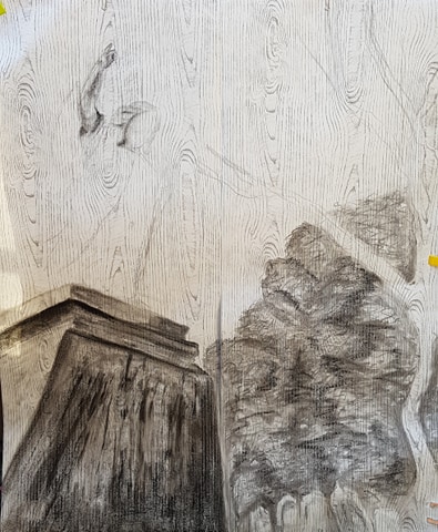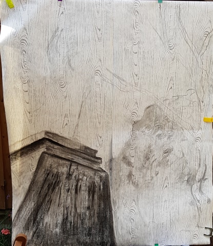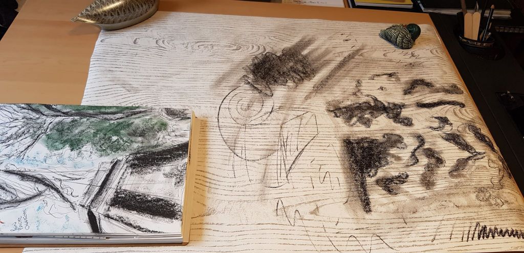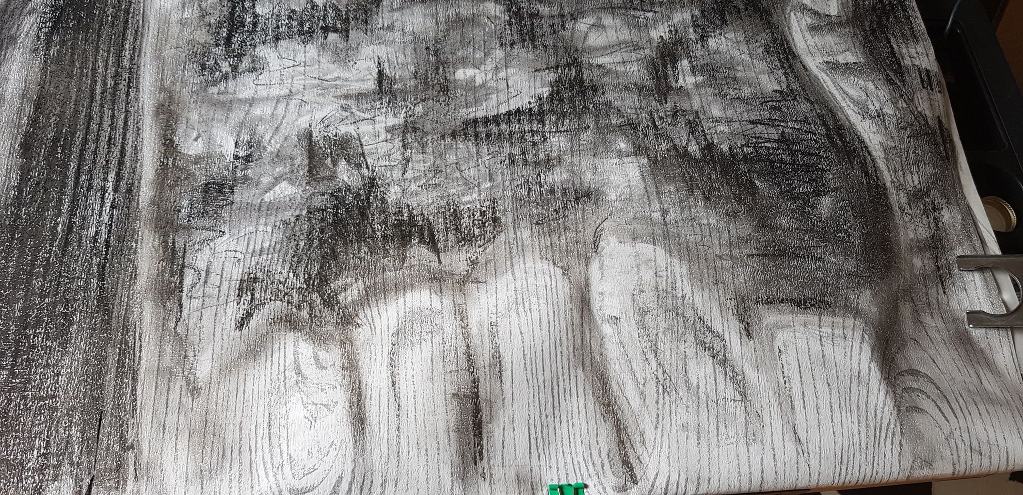 Below – testing material shapes, lines, blending and smudging on wood grain pattern wallpaper. Charcoal.