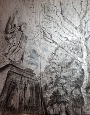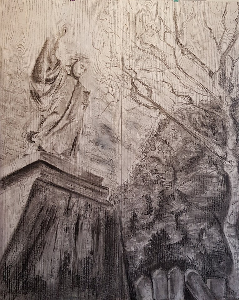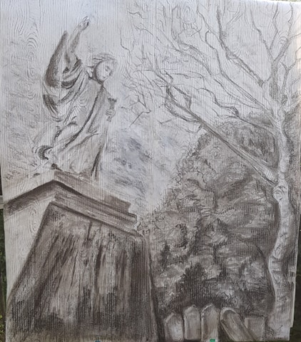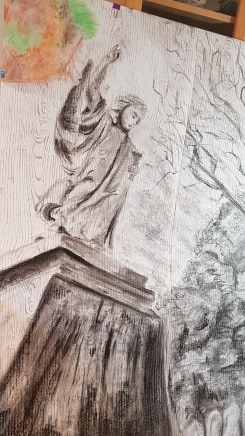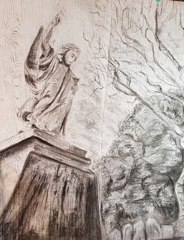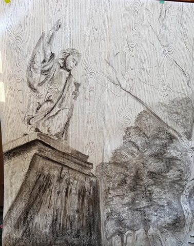 Once the paper was mounted on the card, I mapped out a basic outline of the objects and spacing on the piece with very light charcoal – using the point. It was important to get the perspectives of the whole piece correct before toning it. Perspective was a very important element to the story the image was supposed to convey – adding drama. I started work in the bottom left quadrant, on the stone plinth of the statue. This base was to be the main focus of the drawing. It was weighty, imposing and one of the darkest areas of the drawing. I applied charcoal with the side of the stick, using heavy sweeps for the darkest areas. I drew lines down the plinth with smaller pieces of charcoal and then lines with the end of the charcoal. I pulled a wet brush downwards – to try and reproduce years of rain running down the stone.