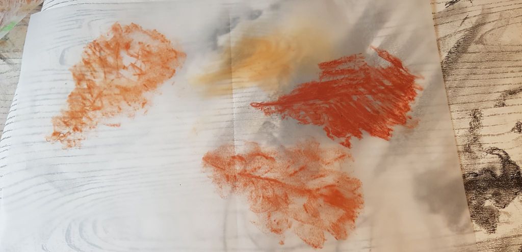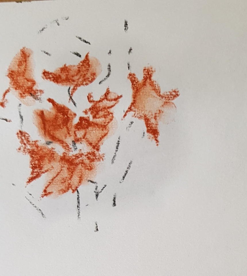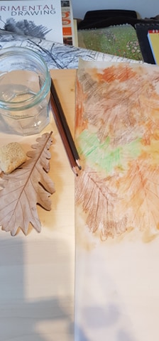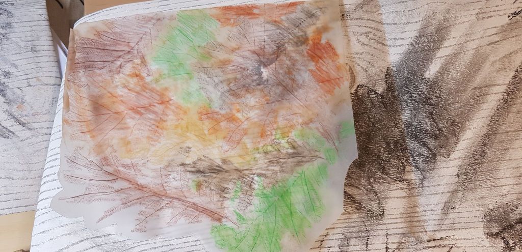 I did consider adding a splash of colour to the top corner of the the picture. The original photos had a canopy of leaves behind the angel’s head. I do like to add a colour accent to images. I tested some leaf images with smudged brown/orange pastel. I then did some experiments with leaf rubbings on tracing paper – to see if I liked how these looked. I was going to stick the tracing paper over the top of the left top corner as a translucent hint of leaves in the wind – but I decided against it. I thought it added a distraction and complication that I didn’t really want.