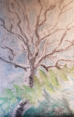 I drew the outline of the white birch tree trunk on the right, using sparse, directional shading to hint at shape and shadow.