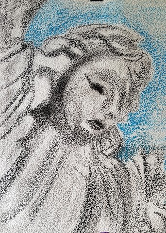 My pondering resulted in my need to add some extra clouds behind the angel, to the left of the piece. The clouds had just stopped in the centre and the balance and flow of the image looked wrong. I didn’t use oil pastels in this area, as I wanted the clouds to fall more in to the background, as the angel needed to be the centre of attention in this quadrant.