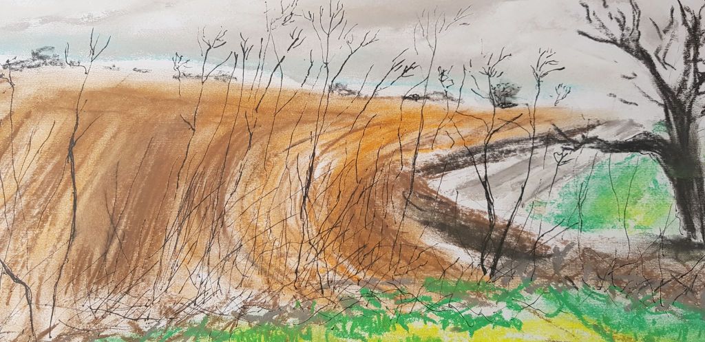 I added a sweep of sky in the middle of the drawing. For this I used charcoal but I also used white oil pastel and white crayon to add some texture and hint at the shape of the clouds. After applying the white oil pastel, I gently cut in to it with a stick to create swirls and break up the cloud forms – I thought this might make them look more realistic.