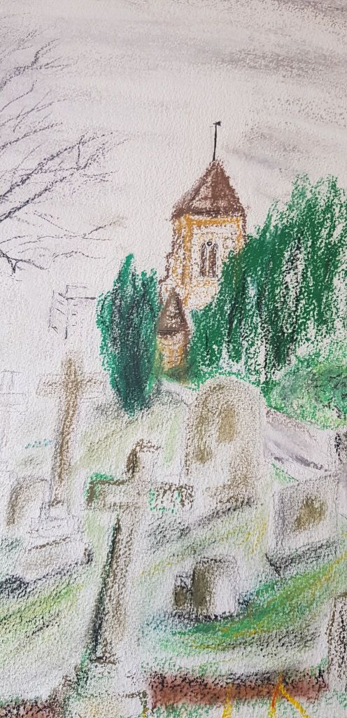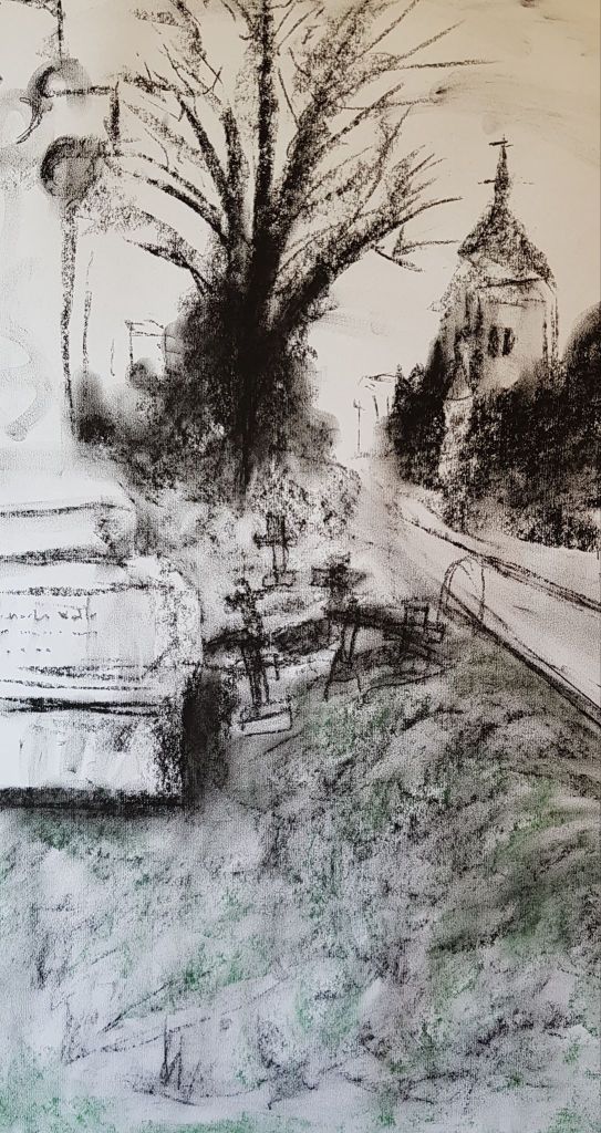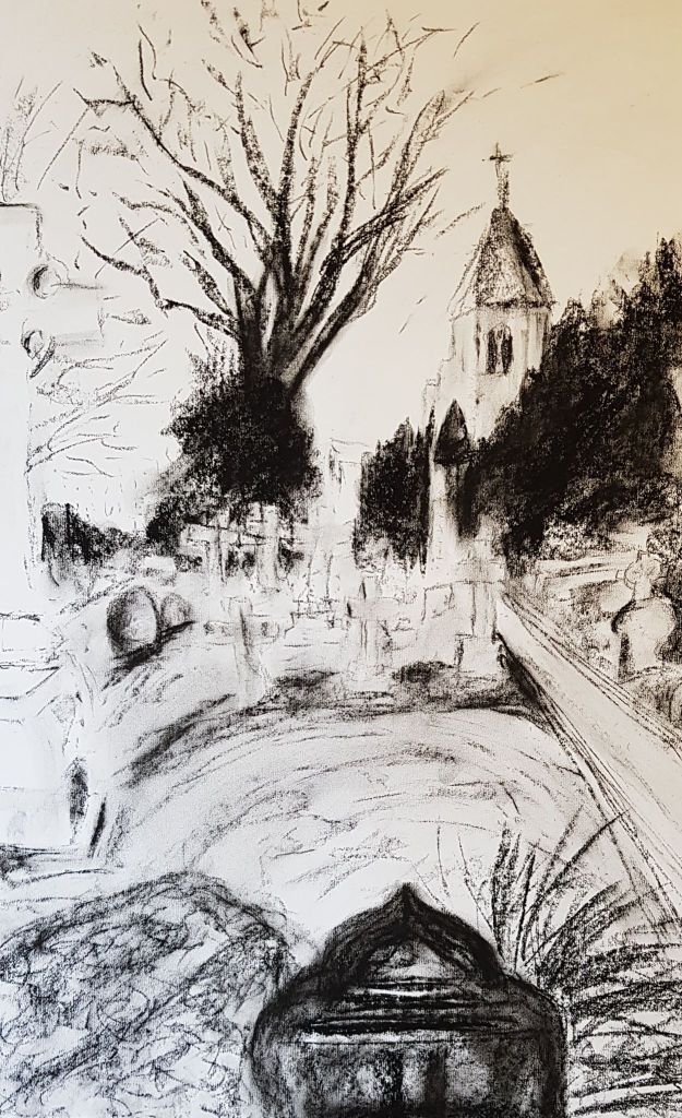What worked – I liked the scale of the piece and the perspective it was drawn from. I think this created some power and sense of gravity. The way the subject matter was put together and what the image is hopefully creates an emotional response. I liked the composition. There were obvious grades of tone used. Tightening up the headstones was a good move. I quite like the trunk of the birch tree – white contrasts with the dark bushy trees behind. I liked the energy flow effect of the wallpaper pattern.