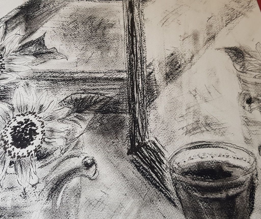 A problem I found was using multi-media effectively. I attempted to use both drawing pen and charcoal in the final assignment. The pen around the mirror frame didn’t add anything to the image, it just gave it too many focal points and detracted from the main focus (the flowers). I was trying to give the piece more texture and interest, but it just confused the eye.