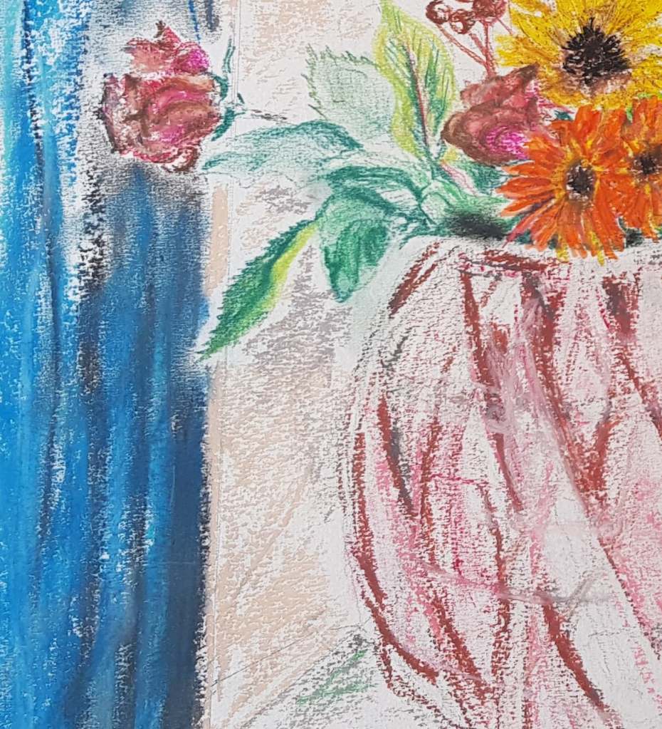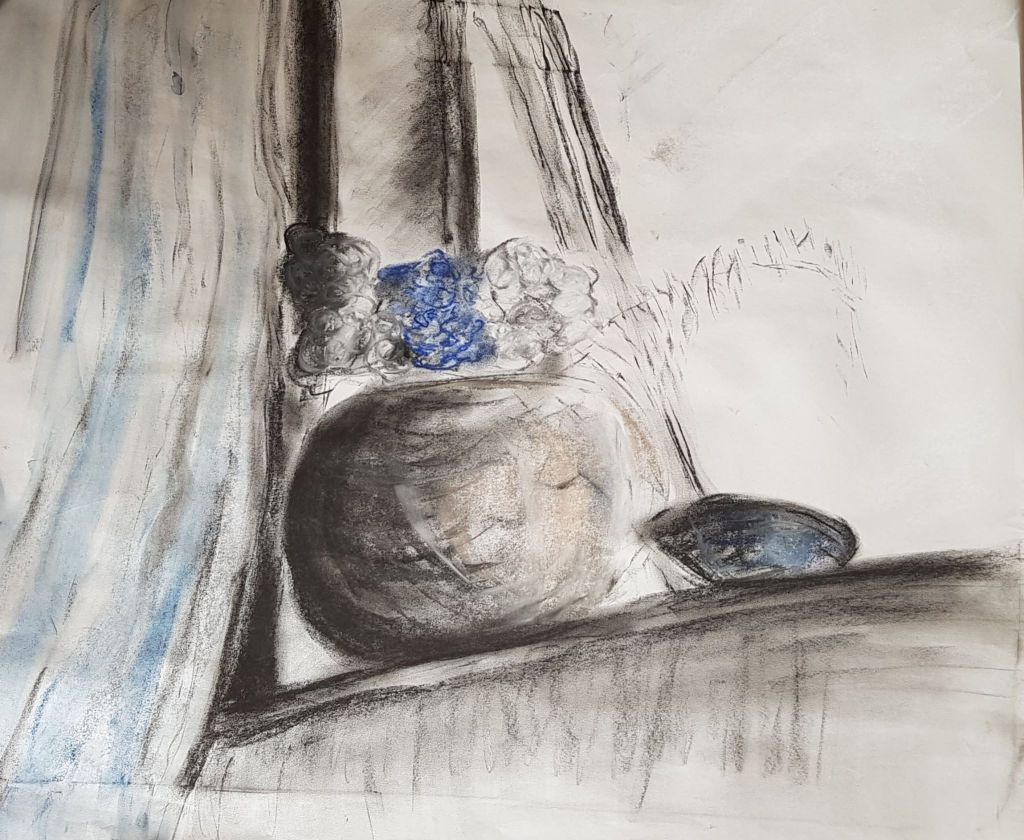 Below, I re-worked the idea of the assignment I produced for part two. I tried to work on improving marks and use of some colour to make the vase more rounded. I tried to lighten and freshen the curtain and not overwork. I added a little colour to help add shape and depth. I didn’t spend much time on this, just over an hour, but I think there are some improvements on the assignment two work. It seems more alive. It maybe could benefit from having more work done on it – to add more shape to the vase. I also only hinted at the flowers in the vase, so the image is rather empty. 594mm x 420mm white paper. Charcoal and soft pastel.
