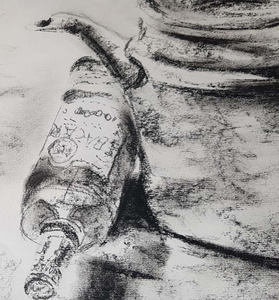 Once the paper was mounted on the card, I mapped out a basic outline of the objects and spacing on the piece with very light charcoal – using the point. It was important to get the perspectives of the whole piece correct before toning it. Perspective was a very important element to the story the image was supposed to convey – adding drama. I started work in the bottom left quadrant, on the stone plinth of the statue. This base was to be the main focus of the drawing. It was weighty, imposing and one of the darkest areas of the drawing. I applied charcoal with the side of the stick, using heavy sweeps for the darkest areas. I drew lines down the plinth with smaller pieces of charcoal and then lines with the end of the charcoal. I pulled a wet brush downwards – to try and reproduce years of rain running down the stone.