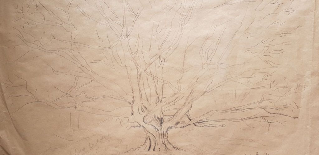 Below – tree drawing on wood grain pattern wallpaper. Testing how the wallpaper would perform. 86cm (h) x 56cm