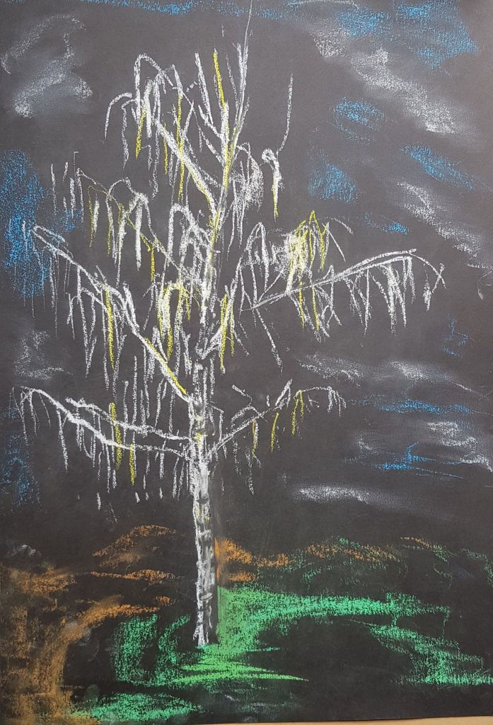 I drew the outline of the white birch tree trunk on the right, using sparse, directional shading to hint at shape and shadow.