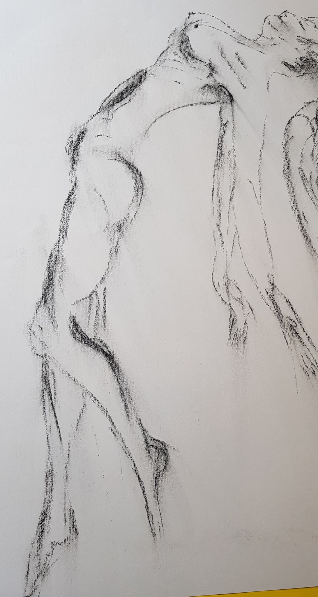 My use of charcoal was developing further. At the suggestion of my tutor I started using an eraser to cut into images – this was helping me graduate tone and pick out lighter spots. I was beginning to really feel that using charcoal is about creating volume and shape with light and dark and that outline is barely necessary. I was definitely getting more confident with it.