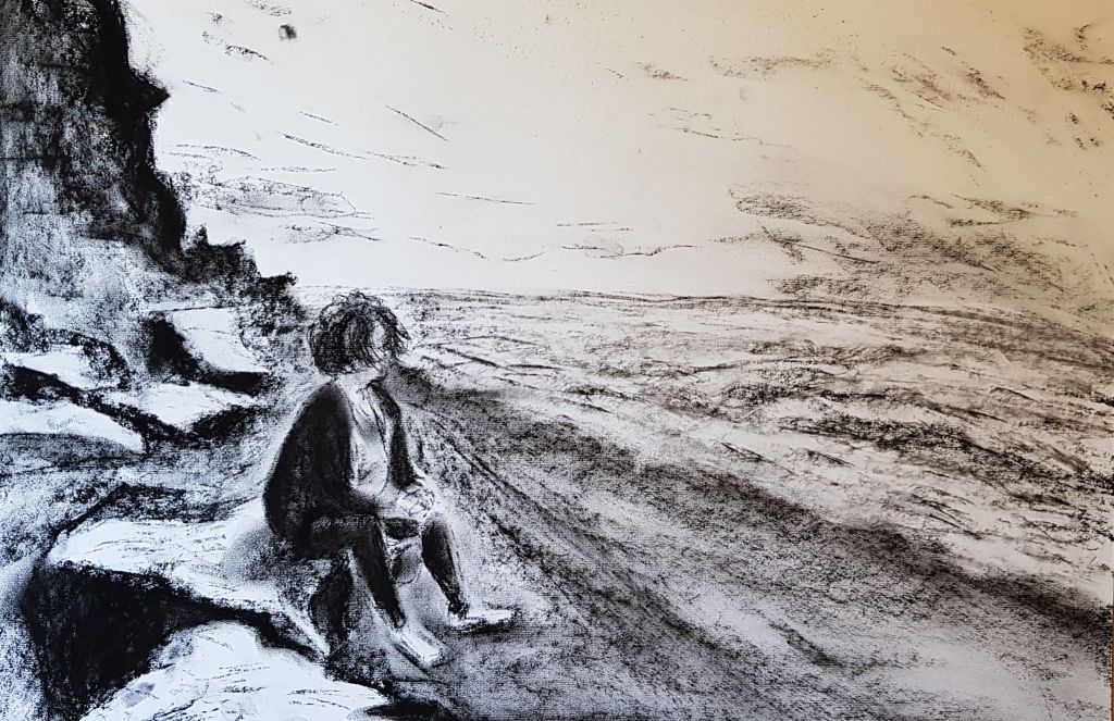 Revisiting part three, below, I tried to work on tone and bring a range of tones and blending into a landscape. I think this did show better blending skills, the figure may be a bit too cartoony and may possibly need more detail, possibly with pencil? 594mm x 420mm white paper. Charcoal.