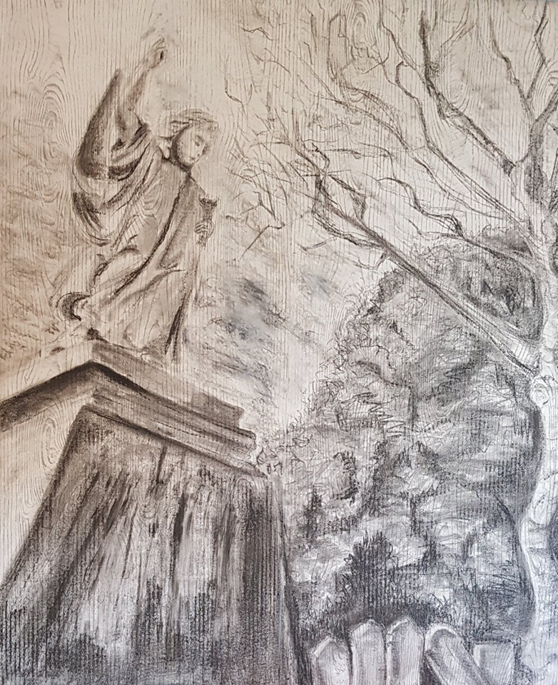 I am drawn to the churchyard theme as it tells a story full of drama. A vast sky hangs over and circles our planet. Beyond it – infinity. The huge, heavy, monumental plinth is dragged down by the gravity of revolving earth. The angel points heavenward. The statue was created by a living person, making us consider everyday human life, death, work, love, religion, material display and financial exchange. Trees and plants remind us of the living, natural earth-bound world. Trees reaching upwards draw their own life from light. So many questions.